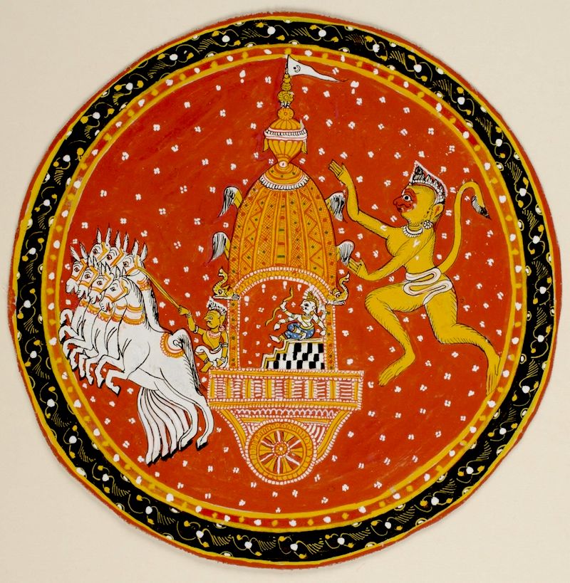 Hanuman, le singe à la force légendaire, fils de Vāyu (Vent) et héro du Rāmāyana, était complètement fasciné par Sūrya. Lorsqu’il était bébé, il aperçut le soleil dans le ciel et le confondit avec une mangue. Se servant de ses puissantes jambes et de ses longs bras, il bondit vers le ciel où il se saisit du soleil qu’il mit immédiatement dans sa bouche plongeant ainsi tout l’Univers dans la plus grande obscurité. Les dieux furent immédiatement alertés et Indra, le dieu de la Foudre, intervint en jetant la foudre sur la mâchoire de Hanuman. Ce dernier ouvrit la bouche et laissa tomber le soleil, mais la foudre lui cassa la mâchoire (Hanu). C’est de là qu’il tiendrait son nom : « celui à la mâchoire cassée. »